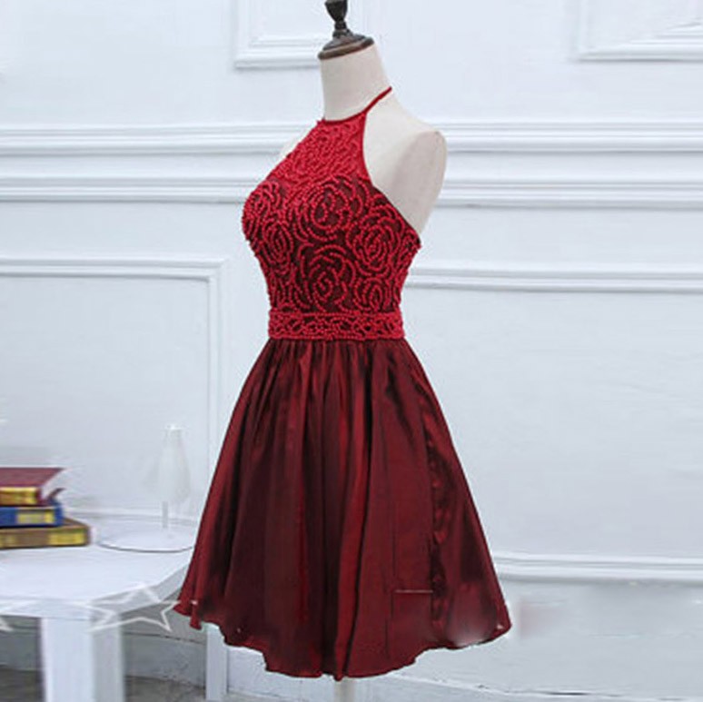A Line Dark Red Homecoming Dresses Sheer Back Sleeveless Crystal