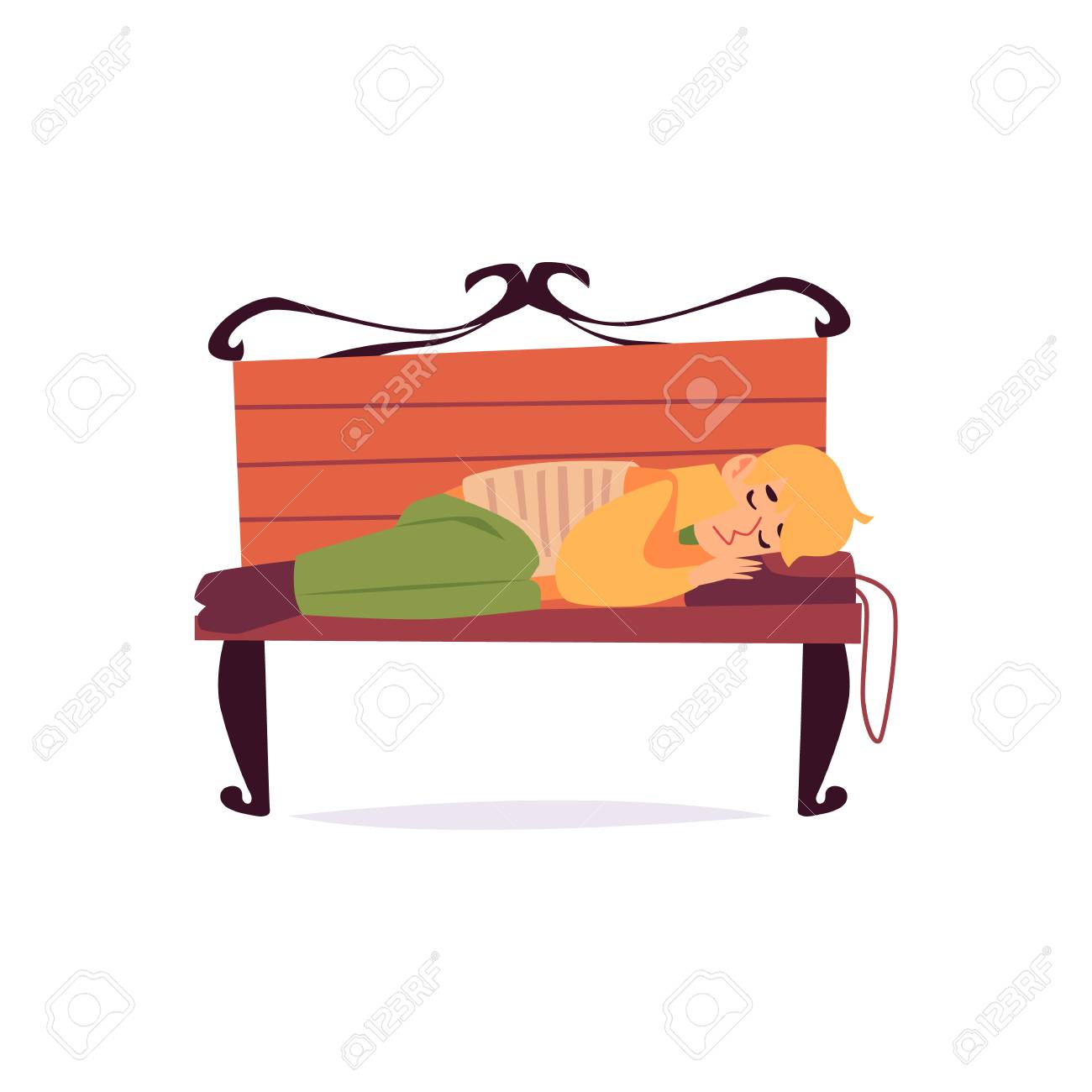 Homeless Man Sleeping On Bench With Head Lying On Bag Cartoon