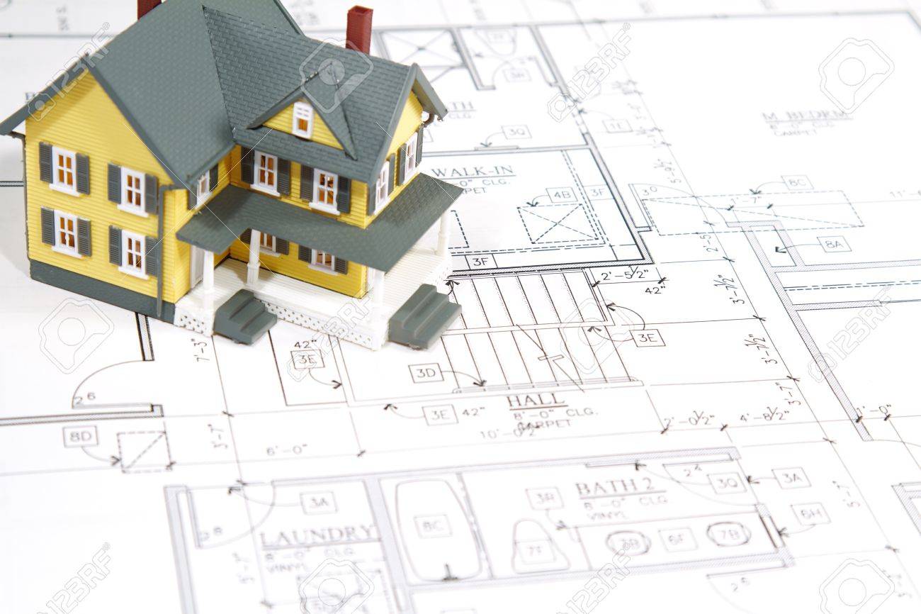 Residential Home Blueprints With A Hand Made House Model Stock