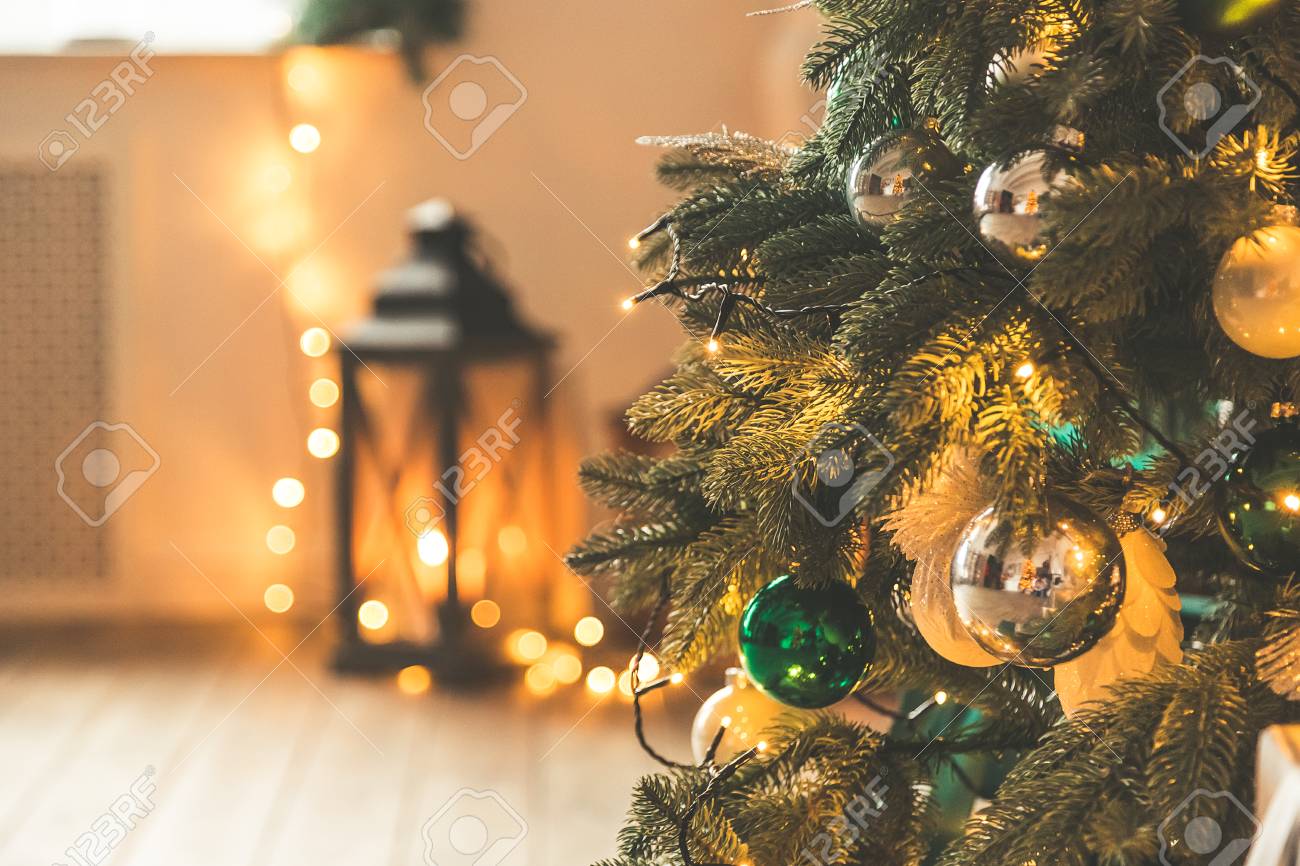 Christmas Living Room With A Christmas Tree And Gifts Candles