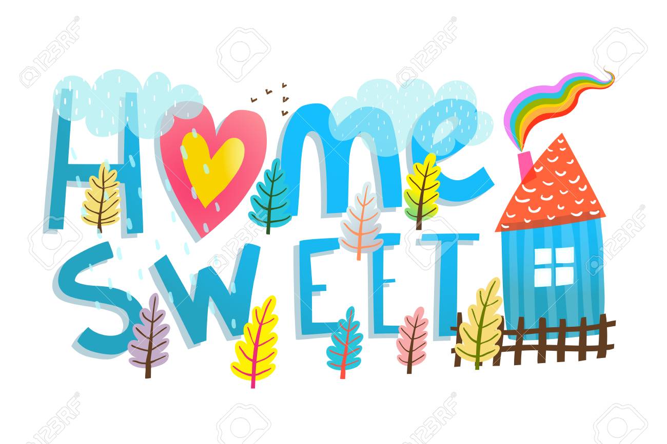 Cute Cartoon House Sweet Home Bright Colors Lettering Flat