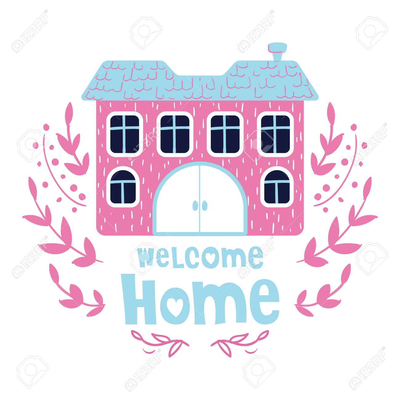 Cute Cartoon House Or Home Bright Colors Lettering Welcome